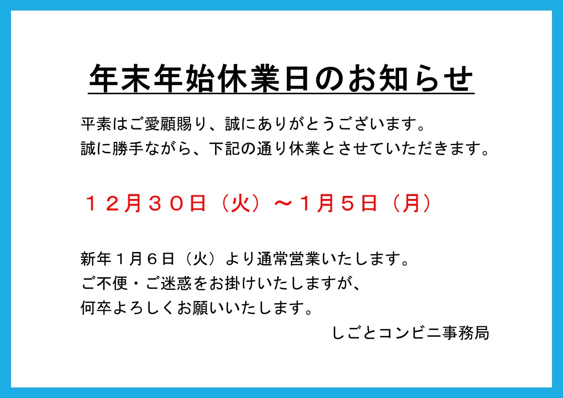 年末年始休業日のお知らせ